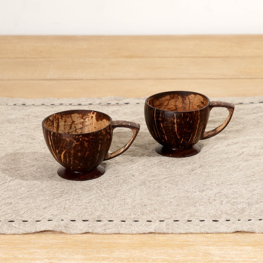 This is a unique and rustic set of two mugs, meticulously crafted from natural, upcycled coconut shells. Each mug retains the beautiful, textured, and earthy brown grain of the coconut shell's interior and exterior. They stand on a sturdy, matching base and feature a handle, all carved from the same coconut shell. The design is simple yet elegant, celebrating the raw, organic beauty of the natural material. This set is perfect for serving cool beverages or as a decorative accent for a kitchen or living space, bringing a touch of natural, bohemian style to your home.