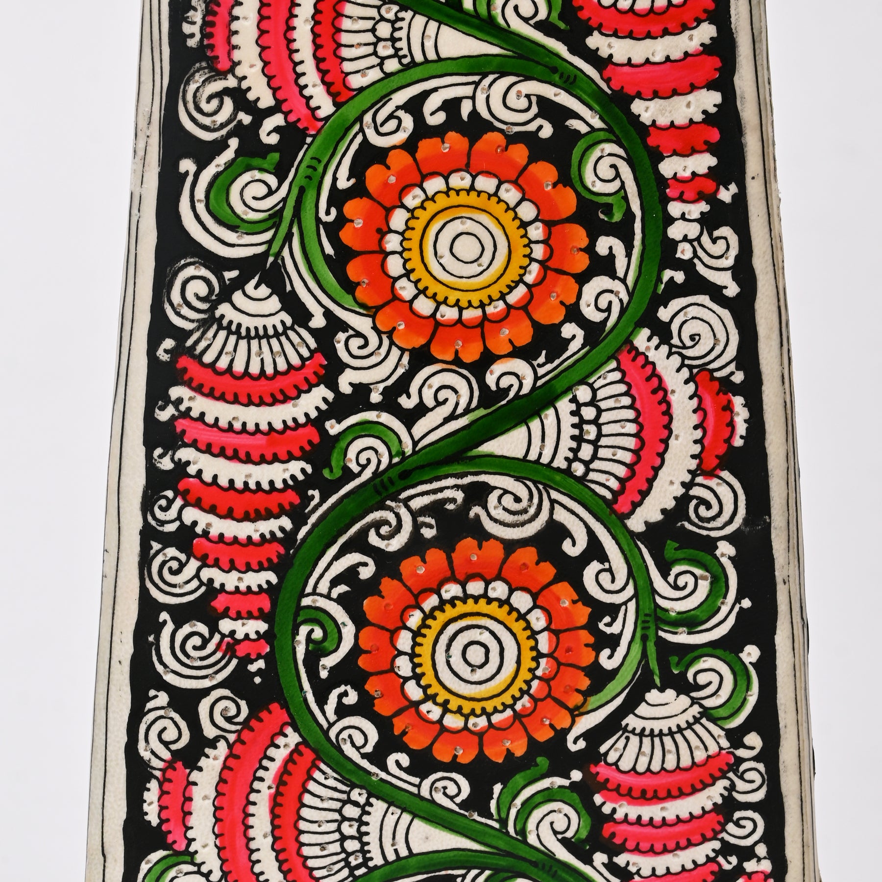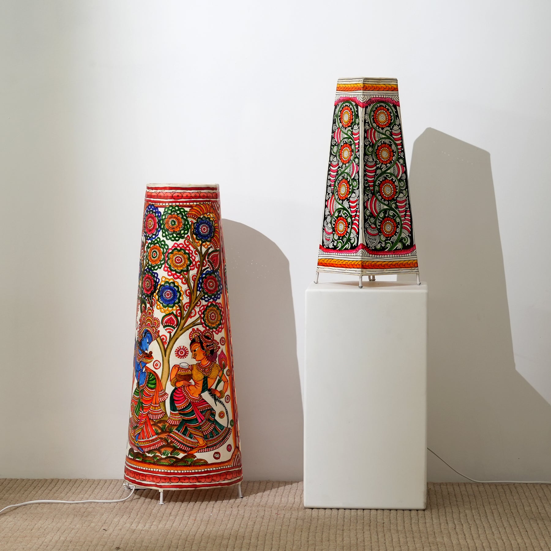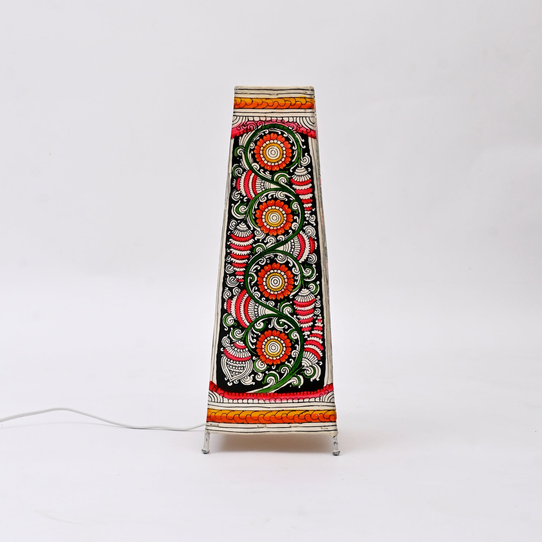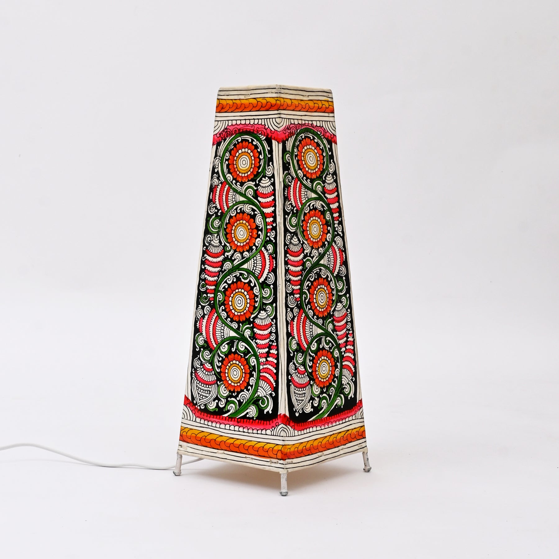 Add a vibrant, handcrafted charm to your space with this 16-inch square lamp shade, designed for both table and bedside lamps. Skillfully made using natural goat leather stretched over an iron rod frame, this shade is hand-painted in rich, multicolored patterns using eco-friendly natural dyes. The tapered silhouette-6 inches at the base and 3.5 inches at the top-adds a touch of elegance while diffusing a warm, inviting glow. Whether placed on a nightstand or side table, this lamp shade brings together traditional artistry and functional design.