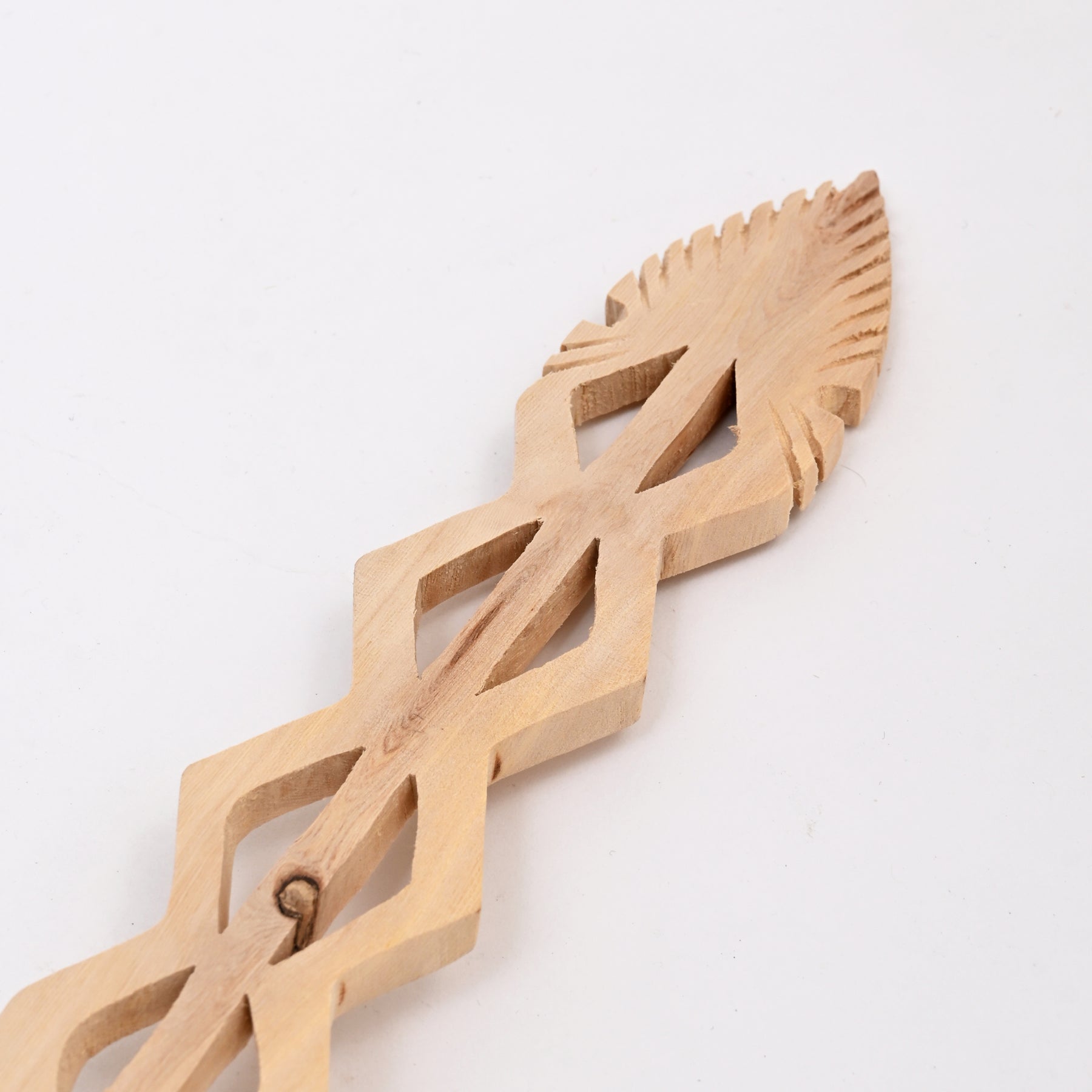 Elevate your dining experience with this beautifully crafted, hand-carved serving set. This unique set includes a long, rectangular wooden bowl and a matching spoon and fork, all meticulously carved from a single piece of light-toned wood. The bowl features intricate cutouts along its sides, adding a touch of rustic elegance. The accompanying spoon and fork boast a distinctive, interconnected diamond pattern on their handles, culminating in a detailed, sun-like motif. Perfect for serving salads, appetizers, or as a decorative centerpiece, this set brings a sense of artisanal charm and natural warmth to any table.