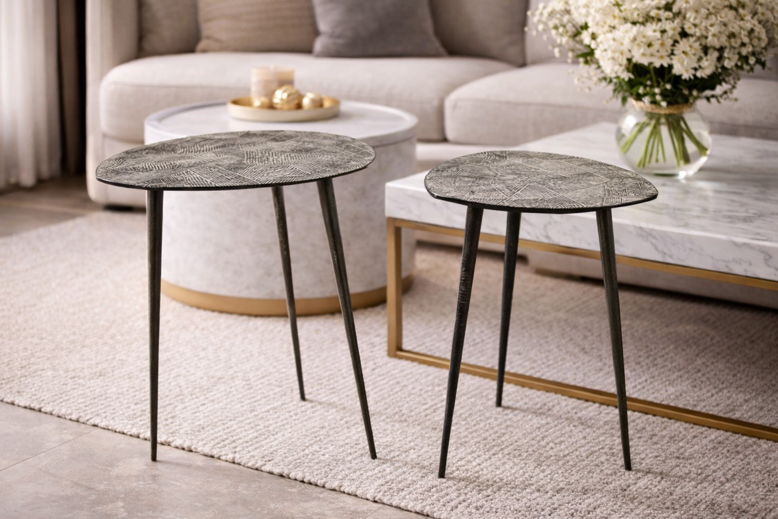 Elevate your interior décor with this set of textured grey metal side tables featuring organically shaped tabletops with detailed radial texture. Crafted from premium metal with a textured grey finish, they combine artistic elegance and durability. Perfect as side tables, accent tables, or display stands, these nested tables complement modern, luxury, and designer interiors while saving space and adding style.