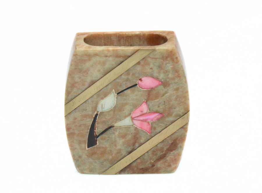 Luxury Beige Soapstone Card Holder with Pink Stone Inlay