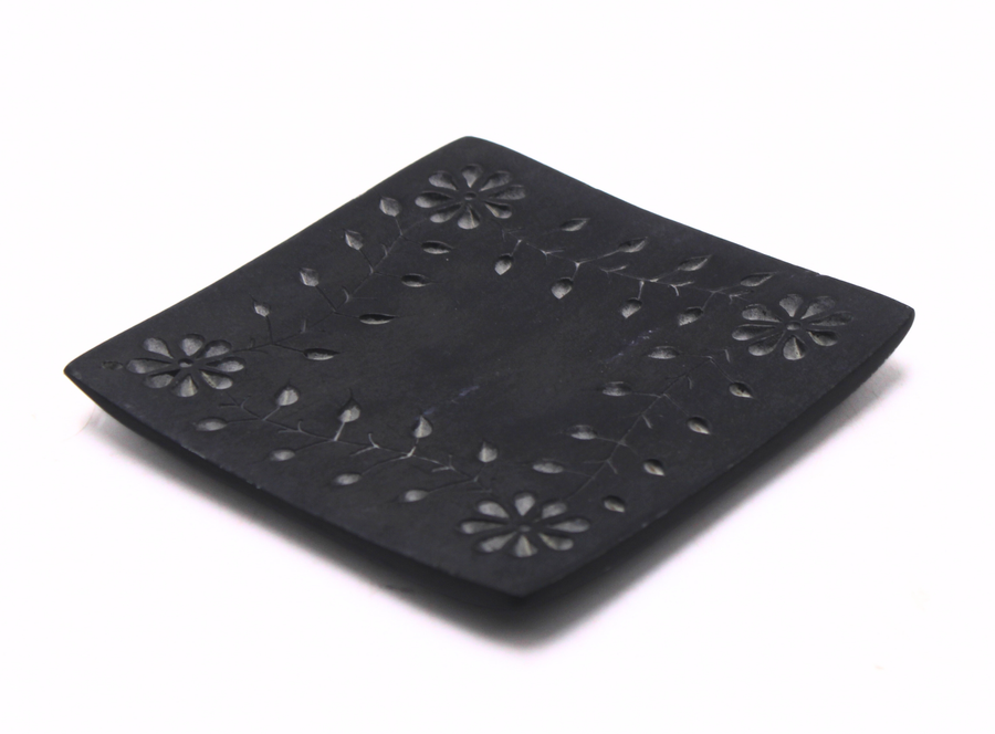 Black Soapstone Square Incense Plate with Flower Carving
