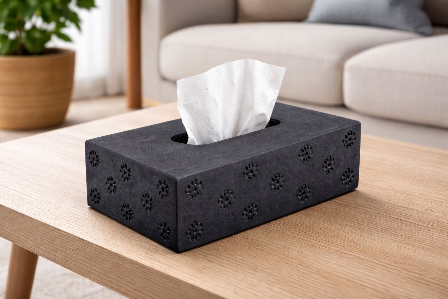 Organize your tissues with elegance using this black soapstone tissue holder featuring intricate flower carvings. Handcrafted by skilled artisans, it combines natural stone durability with detailed artistry. Perfect for desks, countertops, or shelves, this decorative piece adds a touch of sophistication to any interior, complementing traditional, contemporary, or ethnic décor styles while being functional and stylish.