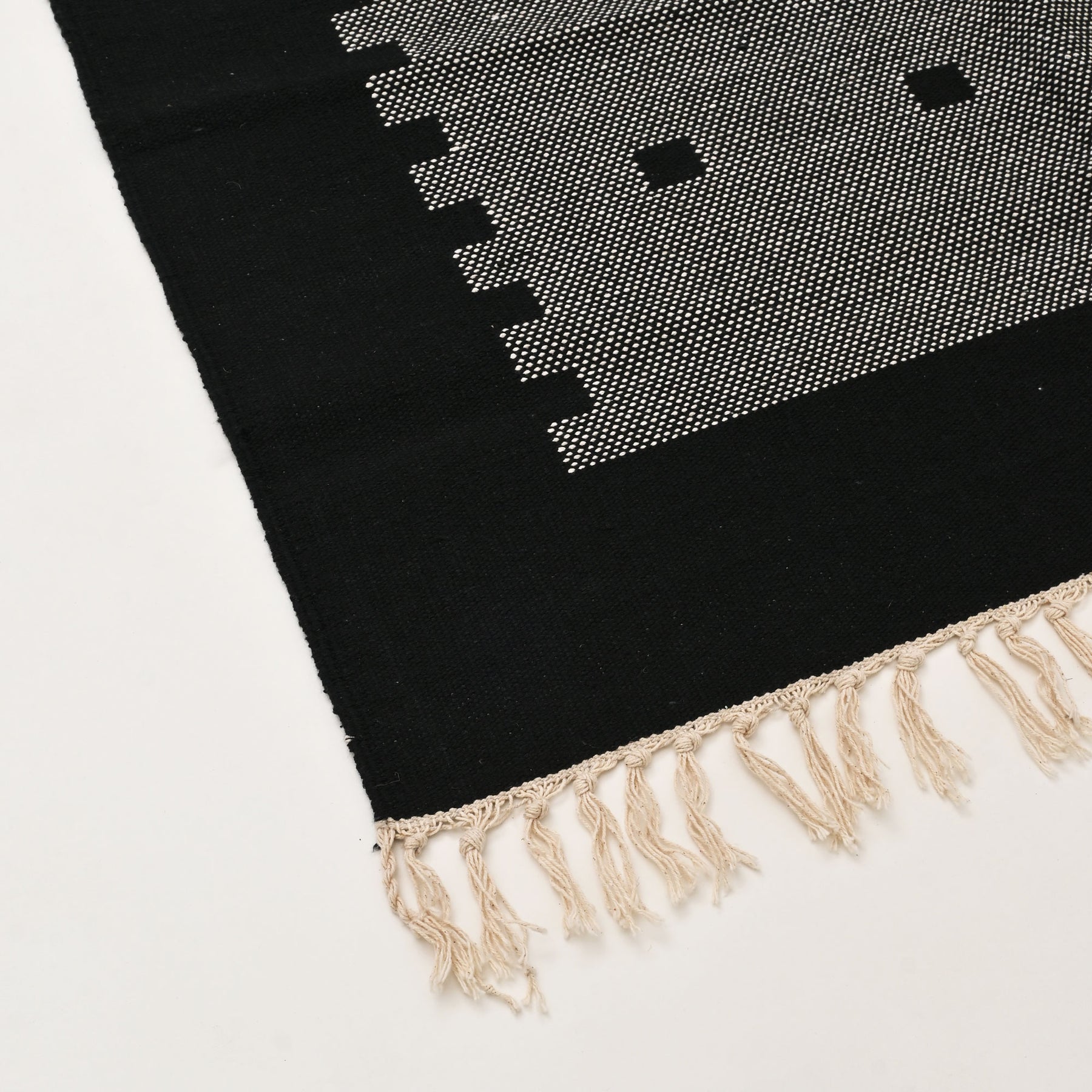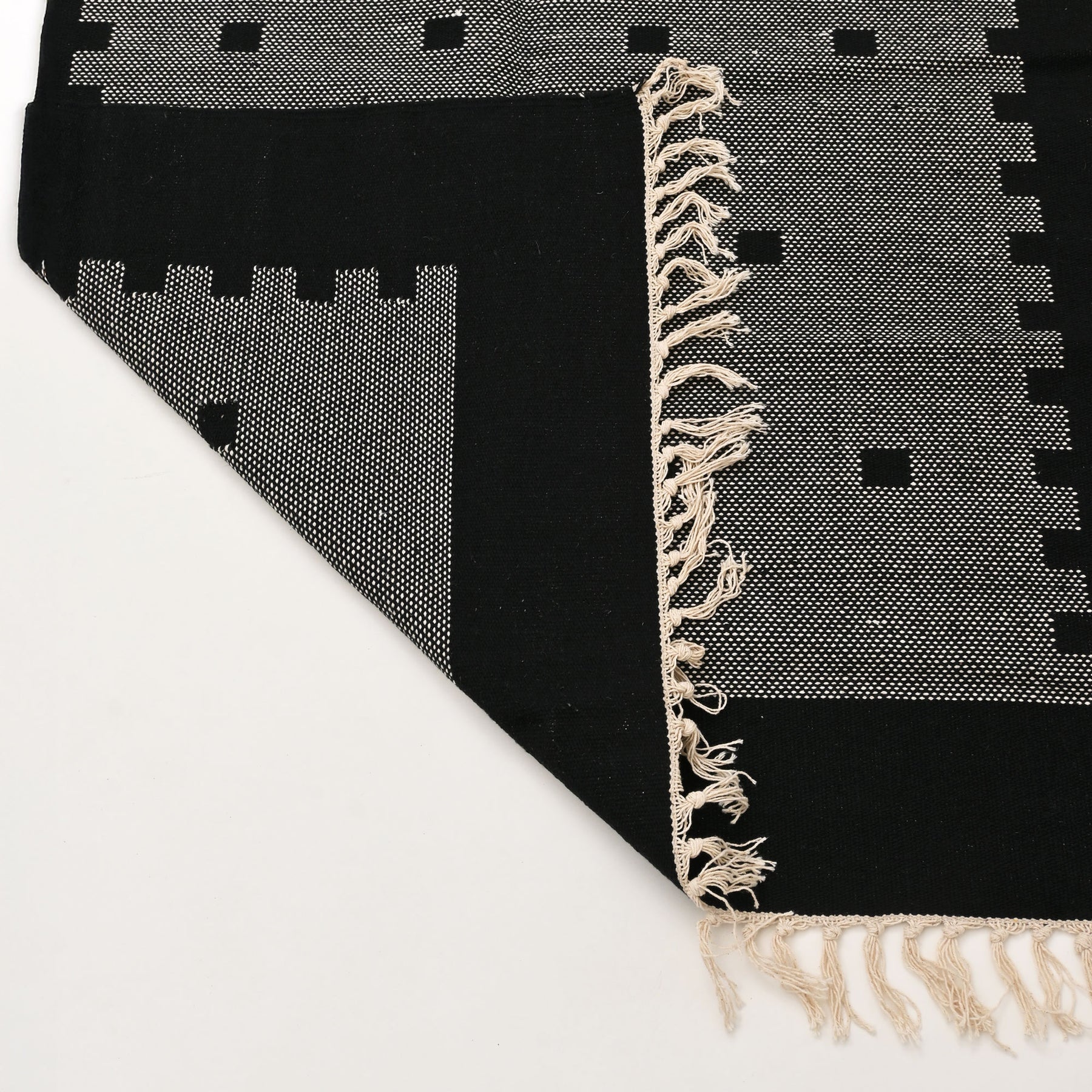 Bring timeless style and comfort to your home with this elegant cotton rug. Made from 100% premium cotton, it combines durability with softness for lasting use. The sophisticated black and white design features a classic black border framing subtle square patterns, complementing a variety of decor styles from modern minimalist to cozy farmhouse. Its flatweave construction allows easy cleaning, making it practical for everyday living. Perfectly sized for entryways, hallways, bedrooms, or as an accent piece, this rug adds understated artisanal elegance to any space.
