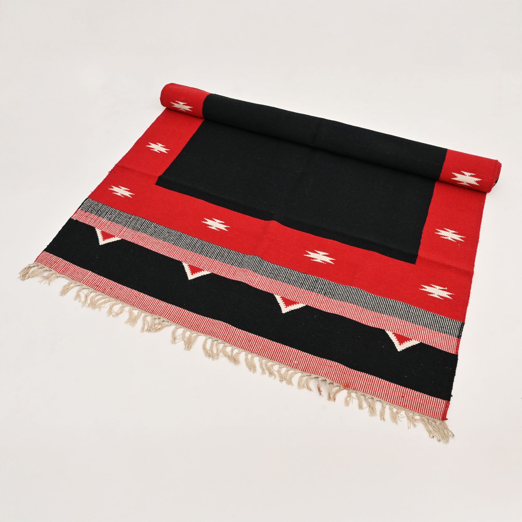 Add a sophisticated touch of tradition to your home with the Kaelam Warangal Durry. This handwoven cotton rug features a striking black center bordered by vibrant red, highlighted with classic white geometric motifs. Crafted from durable cotton, its flatweave construction offers resilience and easy maintenance. Ideal for making an elegant statement in your living room, bedroom, or entryway, this Durry beautifully blends authentic Indian handloom artistry with contemporary style. Bring home a piece that reflects enduring quality and timeless design.